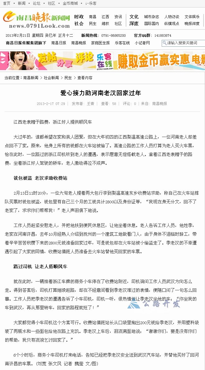 【南昌晚报】梨温高速:爱心接力助河南老汉回家过年
