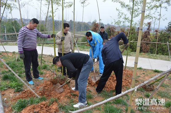 3月11日这天,梨温公司机关“生态园”也种下了近百棵桂花树、樟树等树,一排排秀美绿色的希望之林,一片片生态文明的绿色之林,正向着高速公路的远方延伸。(梨高)
