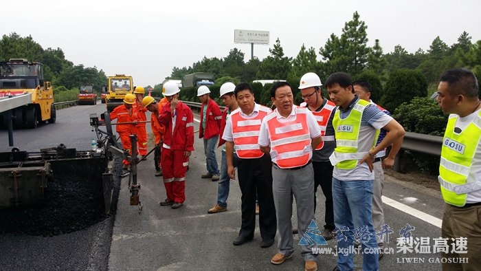 在梨温高速K541——K543处,傅春华实地察看了工程施工情况,详细了解施工质量控制、安全生产管理、工期计划等安排。傅春华强调,养护公司承担的工程时间紧、任务重,要在确保进度的同时,做到安全文明施工,群策群力,齐心协力完成施工任务。