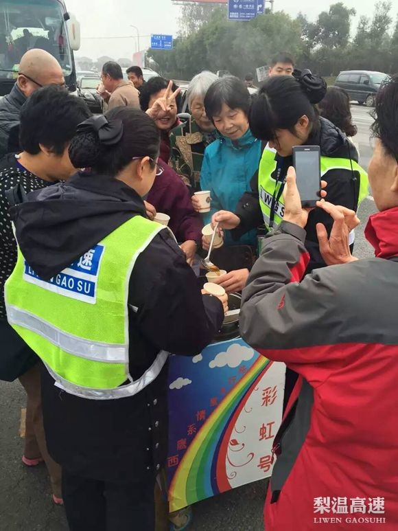 来自上海的一支老年旅行团深受热情的彩虹服务感染,她们有的拿起手机拍照发微信,有的举杯畅饮解焦急。一位朱阿姨这样说到:“我们出门游玩已经十五天了,今日返程途中遇高速公路被雾笼罩,路封了,但高速服务人员给我们送来了暖暖的一杯茶,让人心暖又感动。”