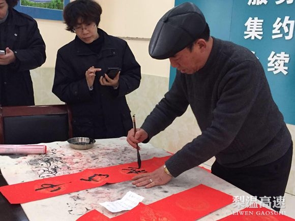 该站特邀上饶市书法家协会副会长张樨林先生为员工开展义务写春联、送祝福活动,现场共赠出五言、七言春联50对,福字50张。
