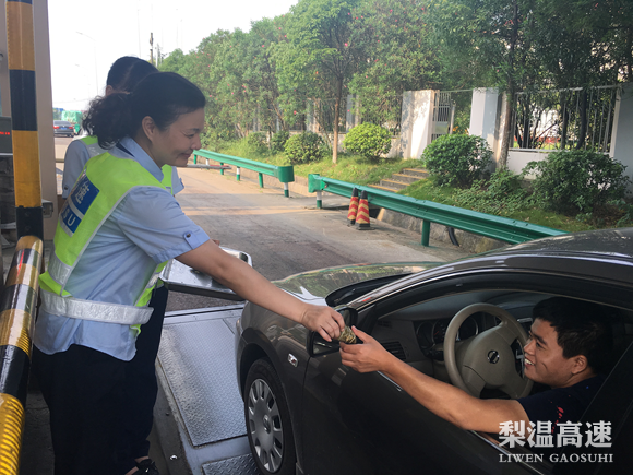 6月9日上午8时左右,为了让行驶在高速上的司乘人员也能感受到过节的氛围,该站员工将自己亲手做的粽子拿到收费车道,开展为过往司乘送粽子活动,并送上节日的问候。