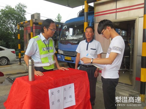 鹰潭西收费站:开展一系列活动营造浓厚氛围。一是组织人员全方位开展培训教育,开展形式多样的活动,组织员工进行全省安全知识考试微信答题。二是联合交警部门在鹰潭西收费车道设立综治安全生产咨询摆台,向广大司乘朋友发放安全出行知识和安全警示安全的咨询服务,切实提高一线员工和社会公众的安全意识。三是组织员工进行安全防火应急预案演练活动,让全体员工了解如何使用应急设备。四是广泛利用LED屏、微博、宣传栏、安全标语等大力宣传安全生产相关知识。