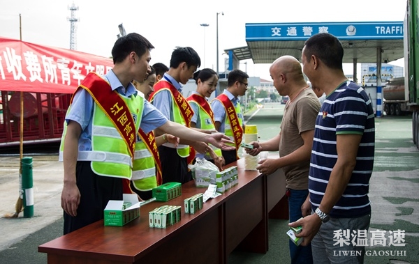 当天上午10点,青年志愿者们头顶着烈日,来到赣浙收费所梨园站收费广场边上,悬挂起横幅,整理好着装,摆放好正气水、风油精等防暑药品,推出绿豆汤、酸梅汤等清凉食品,等候着停车休憩的司乘。
