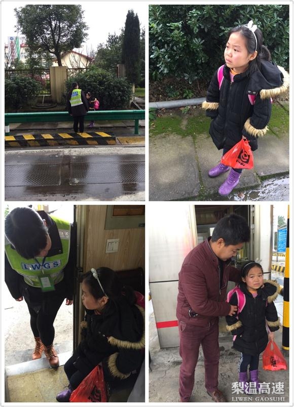 1月18上午11时许,正是春运午间车流量高峰期,梨温高速杨梅岭收费站当班班长毛亦男远远的看见一个背着红色书包的小女孩独自从高速公路走下来,于是她立即上前去询问。