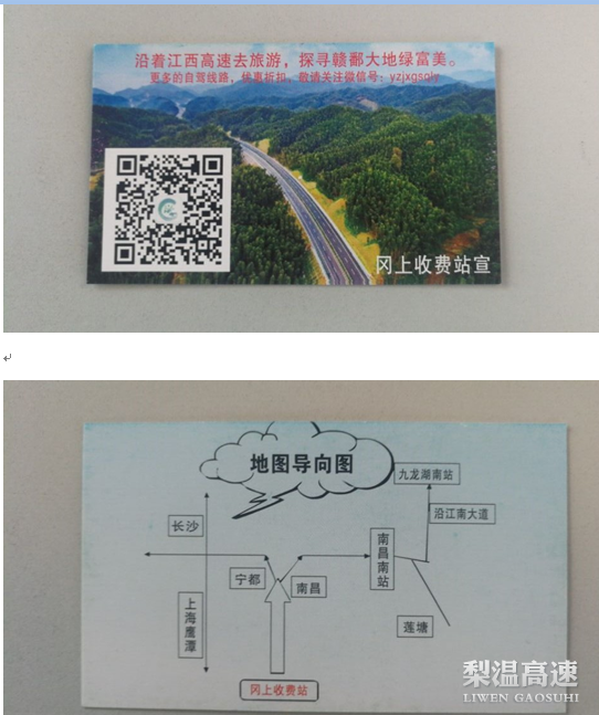 该站针对昌宁连接线开通不久,广大司乘对冈上互通和沿线路线不熟悉情况,专门印发了地图导向和推广沿着高速去旅行公众号的卡片在收费车道进行发放。卡片片详细介绍了收费站周边概况,正面是沿着高速去旅行,提倡低碳环保绿色出行的宣传图片,并附有二维码,反面是地图导向。