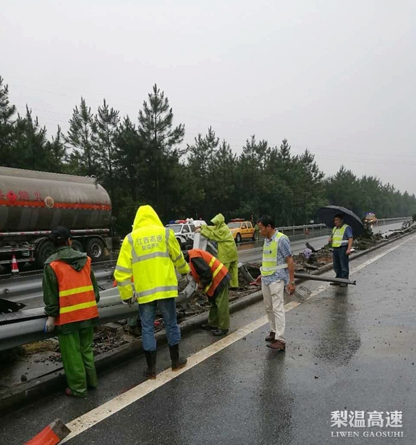 事故发生后,梨温公司上饶养护所迅速赶往现场,组织人员、调配车辆对事故现场进行处置清理。在事故现场看到,车辆油箱已破裂,柴油洒漏一地,一旦遇火或刹车摩擦,都有可能导致重大安全事故。事故所幸没有人员伤亡,但部分护栏被强劲撞击后散落至双向超车道,现场情况十分危险。上饶养护所立即协同交警实行采取交通管制措施,摆放安全锥,警示前方车辆,安排人员疏导交通,对破损护栏进行拆卸、切割,并移除到安全地带。