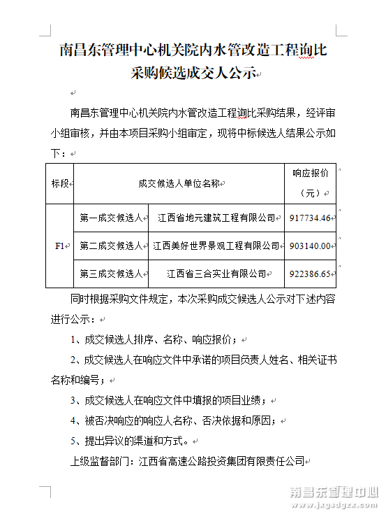南昌南管理中心机关院内水管改造工程询比采购候选成交人结果公示