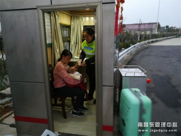 1月31日傍晚6时许,气温约4度,北风3级。南昌南管理中心都昌东站便民服务亭附近出现了一位疲惫不堪的年轻妈妈,她肩负一个大背包,一手推着大号行李箱、一手抱着不足一岁的女婴,在收费广场拦车求助。