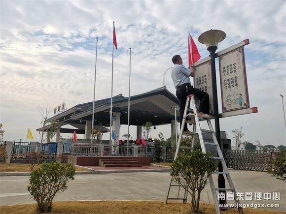 9月24日清晨,樟树东收费所组织员工举行庄重的升旗仪式。通过庄重的升旗仪式去表达浓烈的爱国热情。该所组织干部员工对院区进行大清扫,用焕然一新的一面迎接国庆。一是利用“长扫把”对办公楼及宿舍楼屋檐下的蜘蛛网进行清扫;二是对卫生死角及灰尘较厚的地方进行冲洗;三是在院区围栏处及路灯处插上彩旗、国旗。