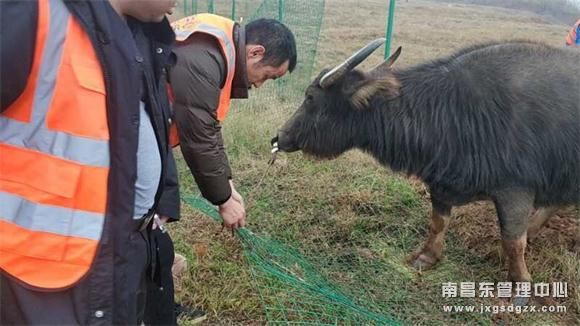 1月15日,新干养护站在日常路况巡查行至K141-+320右幅时,发现有牛群在护栏边吃草。