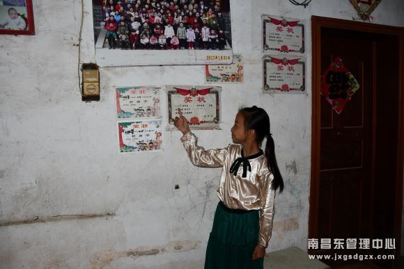 我们看望的第一个学生是9岁的刘雅馨。她的父母以前在外务工,一直跟爷爷奶奶在家,近两年父母为了照顾几个孩子,就在樟树务工,家里一个妹妹,一个弟弟。她爷爷说,雅馨在家里会主动分担家务事,很懂事,非常尊重老人和长辈,生活上非常爱干净,是弟弟妹妹的好榜样。
