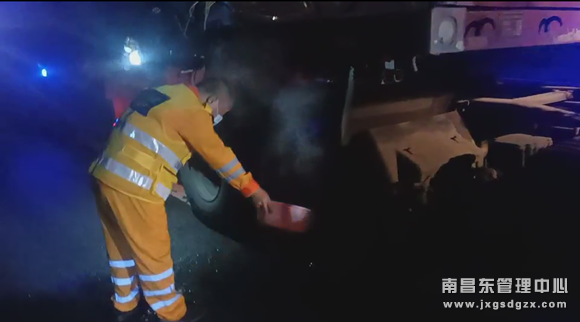 21点30分,南昌南管理中心清障救援队东乡中队接到警报电话,值班人员紧急出动。到达现场了解情况后,该中队队员立即做好安全围蔽,按司机要求开始进行拖车作业,当将该车拖至K624公桩时,该队人员发现车辆有点不对劲,越拖越吃力,便立即靠边停车下来检查。这时候,他们发现车辆中间两侧的轮胎温度很高,于是找到脸盆,爬到护栏外水沟处,用脸盆一盆一盆打水上来,浇至轮胎上进行降温处理,并告知尚师傅,为了避免造成安全隐患,轮胎需要拆除后才能进行拖车。经尚师傅同意后,该队队员立即联系了抢修人员。