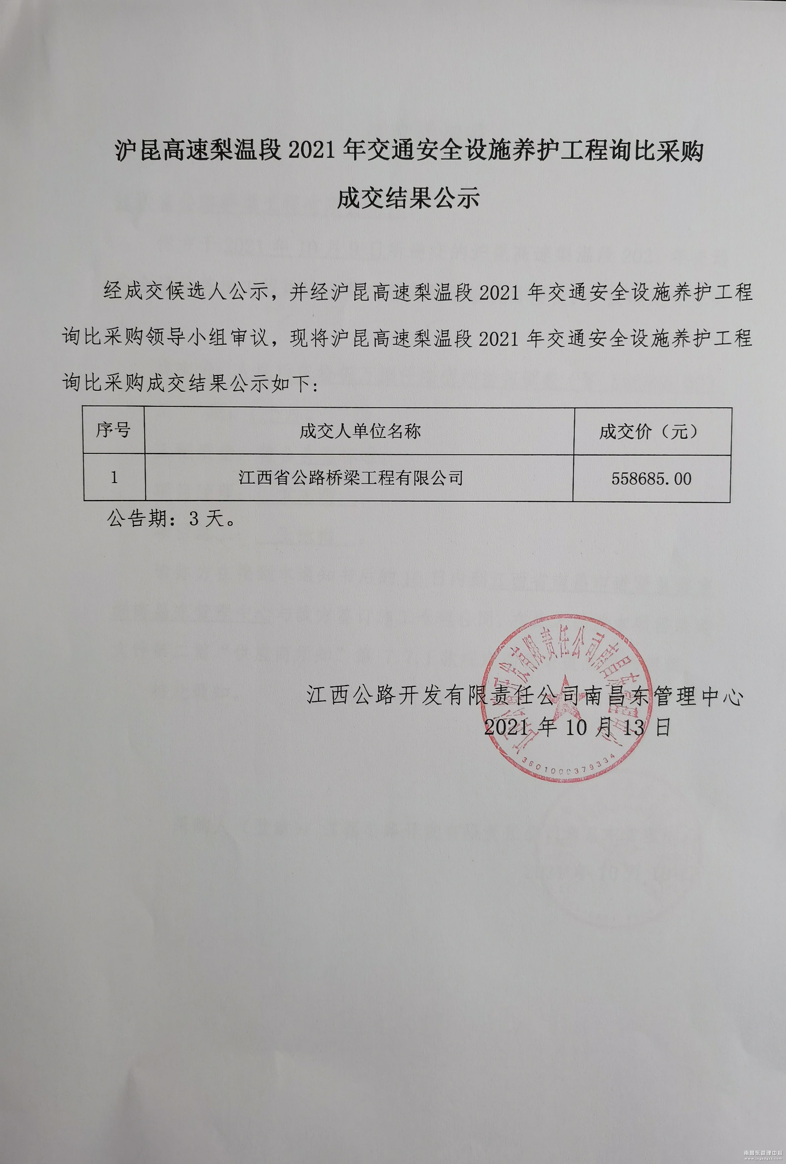 南昌南管理中心沪昆高速梨温段2021年交通安全设施养护工程询比采购成交结果公示