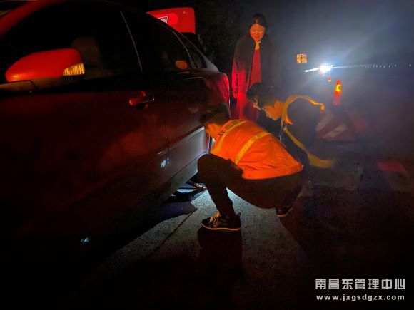 罗湖养护站驾驶员张新春见状立即在一旁停车,下车向车主询问情况,另一名外业技术员普鑫在百米外摆放反光路锥。车主说,他们是在浙江打工的,正逢清明节打算回乡祭祖,结果开到半路爆胎了,现在正准备换胎。