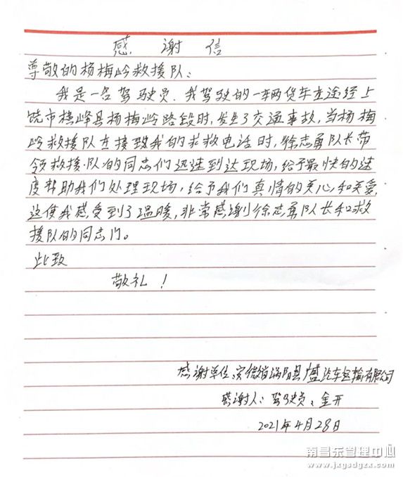 清障救援队杨梅岭中队接到一个电话,电话那头传来一个声音:“你好,我是上次在你那边发生事故的司机,我现在就在你们停车场门口了,你们过来一下吧!我有东西要拿给你。”该中队队长张永义连忙赶往停车场,看到一辆皖牌大货车停在停车场门口,两位中年人在那等候,手上拿着一面锦旗和一封信,热情地握住张永义的手说道:“太感谢你们清障人员那天的热心帮助,这次正好路过这里,想当面再说一次谢谢!”