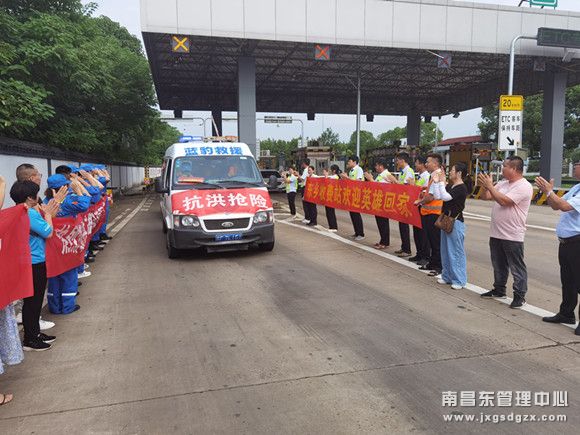 7月28日上午8时左右,江西交投集团南昌南管理中心东乡收费站开辟绿色通道,自发自愿组织欢迎仪式,以最高敬意迎接支援河南的抗洪队伍凯旋归来。
