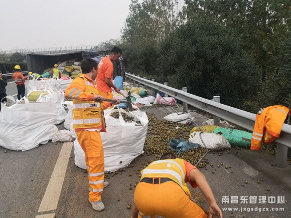 当天下午,该中队值班人员接到报警电话后,火速赶往现场。到达现场后,立即在后方设置了300米安全围蔽,并根据现场情况制定了救援方案。由于事故车辆侧翻在行车道上,车上装载的10吨油茶果全部倾倒在路面上,严重影响了高速公路的正常通行。中队人员见状立马拿铁锹跟扫把先把地面上散落的茶油果堆积在一起,再把包装完好的袋装茶油果迅速搬运到应急车道。为了尽快恢复道路正常通行,在经历了2个多小时的努力后,终于把路面散落和倾倒的袋装茶油果全部搬运至应急车道,并安排转货车辆运下高速。