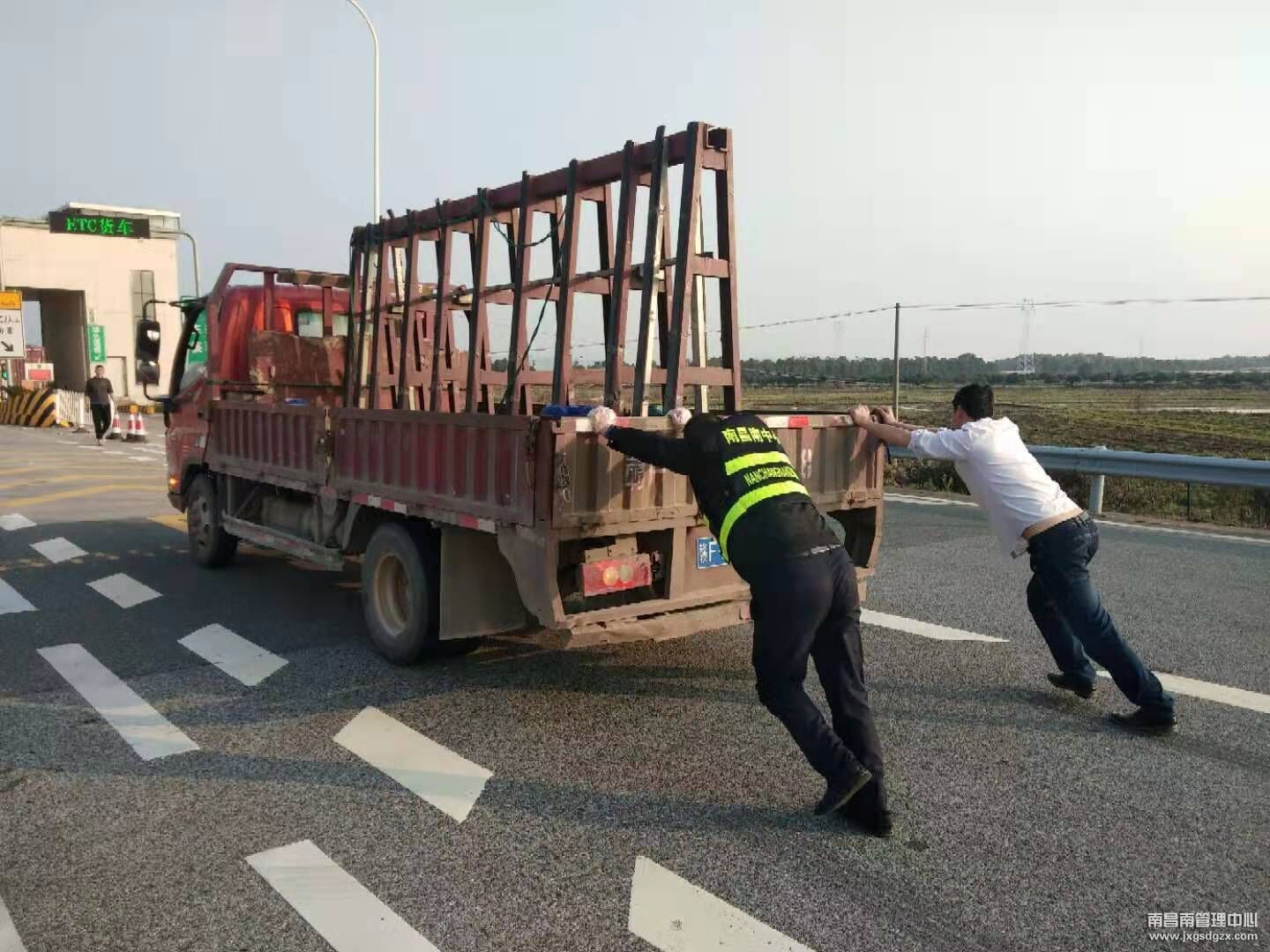 东乡西收费站:货车突然熄火,高速收费员热心帮忙推车