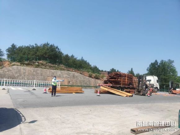 车辆开着双闪,司机在一旁焦急的打着电话,当班收费班长发现后,立马上前查看,经询问得知,该车在浙江湖州装载着一车木材,前往江西抚州卸货,由于装货时木材没有固定好,行驶至半道,货物严重倾斜,随时都有倾覆的危险,当班班长得知后,立马为其联系了叉车,并在车辆周围摆好反光锥,提醒过往车辆。
