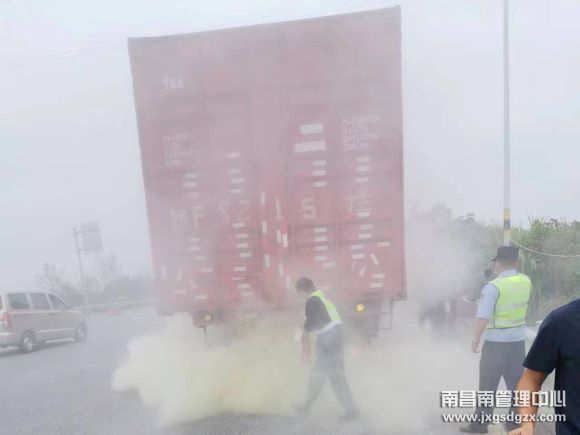 着火的轮胎冒起滚滚浓烟,气味恶臭,十分难闻,浓浓的烟雾熏烤在众人的脸上,但是陈仁和等人并没有退缩,依旧决然地浇洒着起火的车胎,在大家的齐心协力下终于将火扑灭。因施救及时,处理得当,货车司机未发生较大的损失。