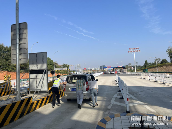 10月3日上午,一辆银白色面包车在进贤收费站下高速时突发故障,停在车道内无法启动。