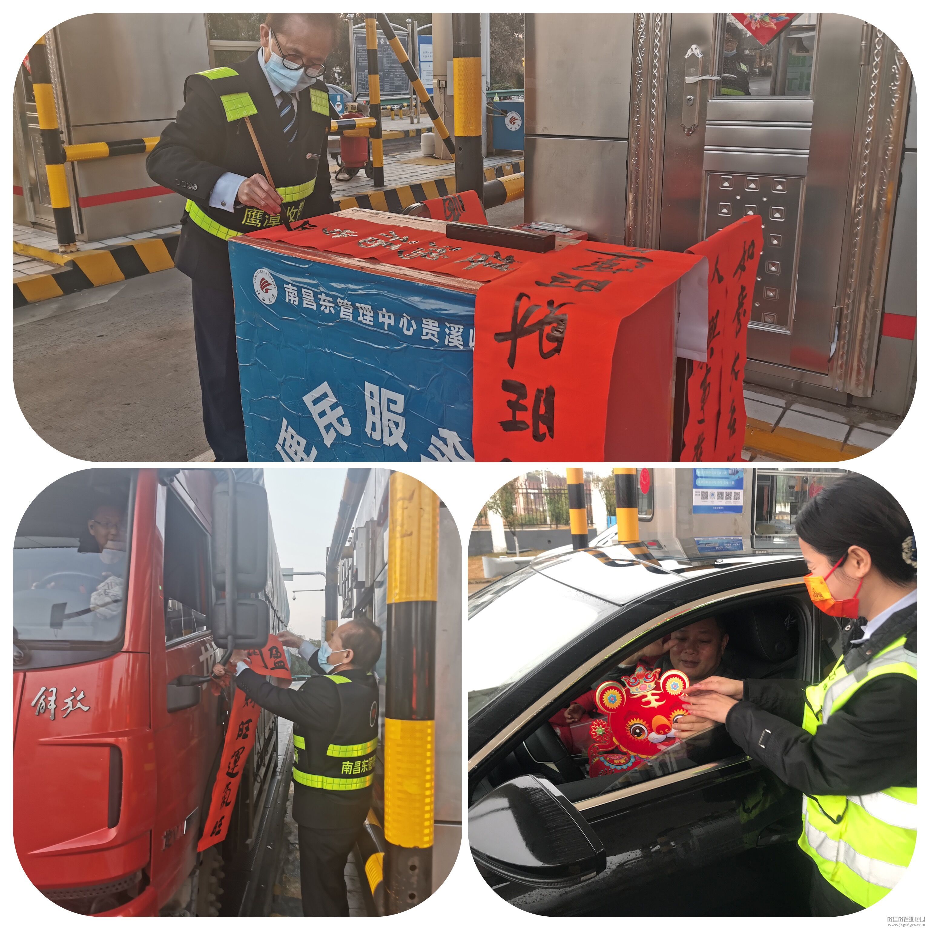 “师傅,送您一幅对联,祝您新年快乐,虎年大吉。”妙笔生花送祥瑞,翰墨留香迎新春。在桥东收费站,“义工联”班组在收费广场设置了便民服务台,将一幅幅喜气洋洋、饱含新春祝福的对联、“福”字送给过往司乘,也把满满的关怀、浓浓的年味、深深的祝福作为新年礼物送给广大司乘朋友。同时还为司乘提供热水、路况咨询、路线指引等便民服务活动。