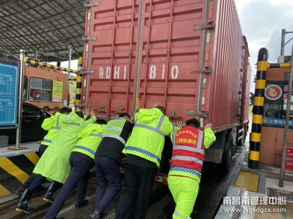 1月16日上午11:30左右,一辆三轴货车在南昌南管理中心上饶经开区收费站出口105车道交费时突然熄火,司机尝试启动多次都失败了。当班班长见到此情况,迅速拿起对讲机呼叫其他同事及保畅队队员前来帮忙。