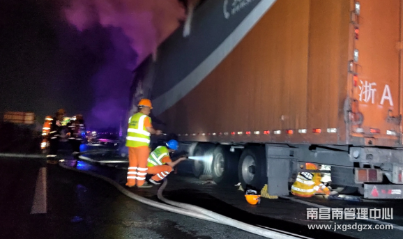 21点30分,余江中队值班人员接到电话后,立即组织车辆设备、人员前往现场,一人用随车灭火器控制火势,一人做好后方安全围蔽。为了保护过往车辆的安全,在交警的协助下,救援人员在距离现场500米处进行了车道全封闭,并安排预警车辆在后方鸣笛预警。