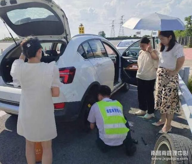 7月19日下午,一辆白色小轿车行驶至南昌南收费站,由于车辆爆胎停在收费广场应急车道,值班站长谢斌了解到这一情况后,迅速安排人员为其更换备胎,解决了问题。