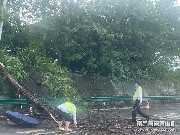 8月31日中午,风大雨急,南昌南管理中心鹰潭西收费站内广场护栏边上一颗大树被大风吹倒在车道中间,导致道路受阻,该站快速反应,启动恶劣天气应急预案,仅用20分钟恢复道路畅通。