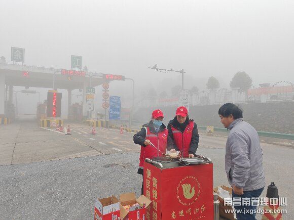 “师傅,我们食堂准备了早餐,有鸡蛋面、八宝粥、方便面、饼干,先吃点垫垫肚子,等雾散了再赶路……”1月4日在南昌南管理中心余江收费站外广场,收费站工作人员正热情地邀请因大雾滞留现场的司乘用餐。