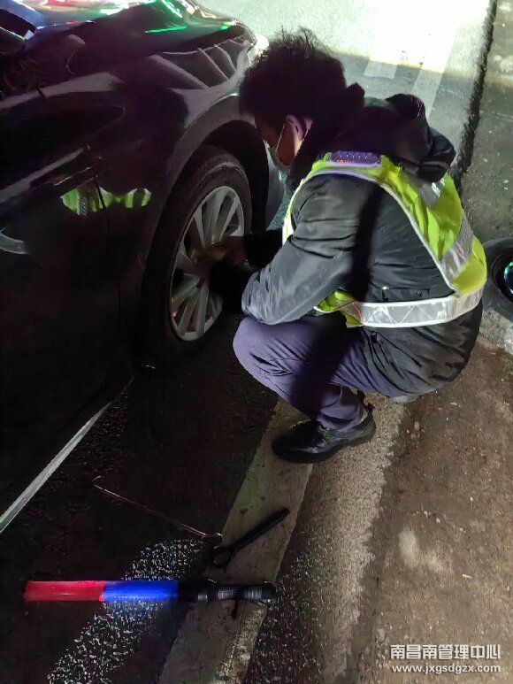 当班班长巡查车道时发现该车开着双闪,车主一行3人站在车旁神色焦急,经上前询问得知,这一家3口从浙江杭州出发回广东过年,因车子燃油不足,下高速加完油后打算调头上高速,刚行驶到广场发现轮胎破了,因没有换胎经验,只能停在一旁焦急的打着电话。