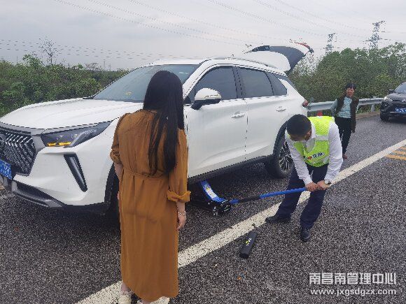 “能帮帮我们吗?我们的车子爆胎了,现在不知道怎么办。”4月17日,南昌南管理中心南昌南收费站入口广场一辆白色SUV因为爆胎停在了广场中央,随即当班工作人员也接到了车上司机的求助。