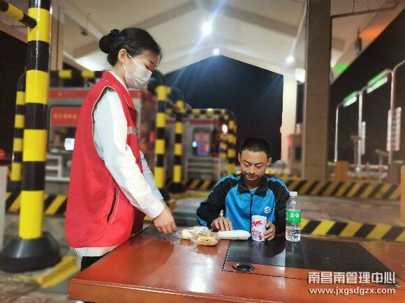 5月13日晚上23时许,南昌南管理中心桥东收费站收费班长正在外广场巡查时,发现一名穿着校服,拿着行李的学生准备上高速时,立即上前询问具体情况后带到收费站服务台休息,并为其准备了泡面、八宝粥等食物。