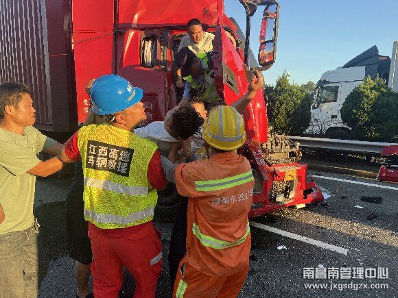 7月7日,在沪昆高速上海方向K561公桩处发生一起两货车追尾事故,其中一名驾驶员重伤被困,情况危急,江西交投南昌南管理中心南昌南车辆救援大队杨梅岭中队紧急出动,成功将受伤驾驶员快速解救并安全护送。