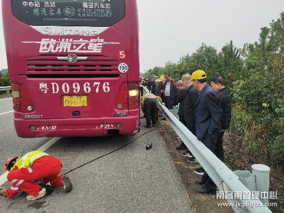10月23日,一辆载有45位司乘的旅游大巴途径南韶高速南昌方向K50公桩时,因轴承突然断裂,车辆被迫罢工在了应急车道上,南昌南管理中心南昌南车辆救援大队洛市中队紧急出动,暖心救助,受司乘人员点赞。