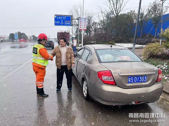 1月22日下午13时,沪昆高速南昌方向K614公桩处,一辆小车因车辆故障被大雪滞留在辆高速公路上,南昌南车辆救援大队鹰潭中队主动伸出援手,帮助司机脱困。