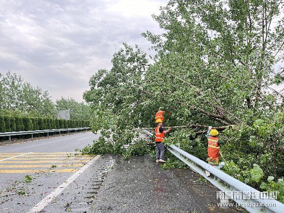 4月16日上午,南昌南管理中心东乡养护所洛市养护站所辖广福到铁路路段遭遇强雷电、短时强降水等强对流天气影响,导致路侧有大量树木倒伏占用行车道,影响行车安全。