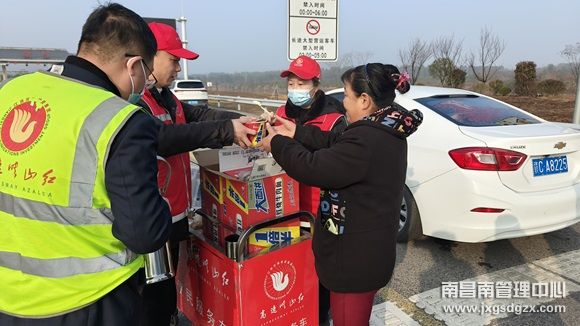 2月4日,因大雾天气影响,高速入口暂时封闭,南昌南管理中心丽村收费站的志愿者们为滞留在收费广场的车辆提供便民服务。