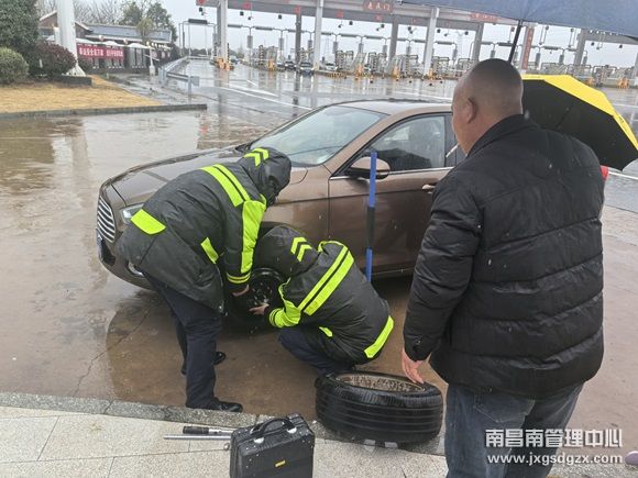 2月16日,一辆咖色小轿车在南昌南管理中心南昌南收费站上高速时突发爆胎,被迫停在收费外广场,收费员冒着大雨,热心为司乘更换轮胎,助力司乘春运平安出行。