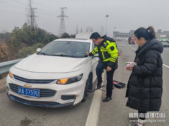 当天上午7时30分左右,一辆赣A牌小轿车停靠在距南昌南收费站100米外的高速护栏旁,急促的双闪引起了收费站工作人员的注意。经员上前查看得知,小轿车因爆胎无法前行,女司乘面临困境,焦急万分。了解情况后,工作人员迅速采取行动,一方面在故障车周围布置好反光锥,警示后方来车注意避让,确保故障车安全,一方面从综合服务站取来千斤顶、套筒、充气泵等维修工具,为故障车辆换轮胎。